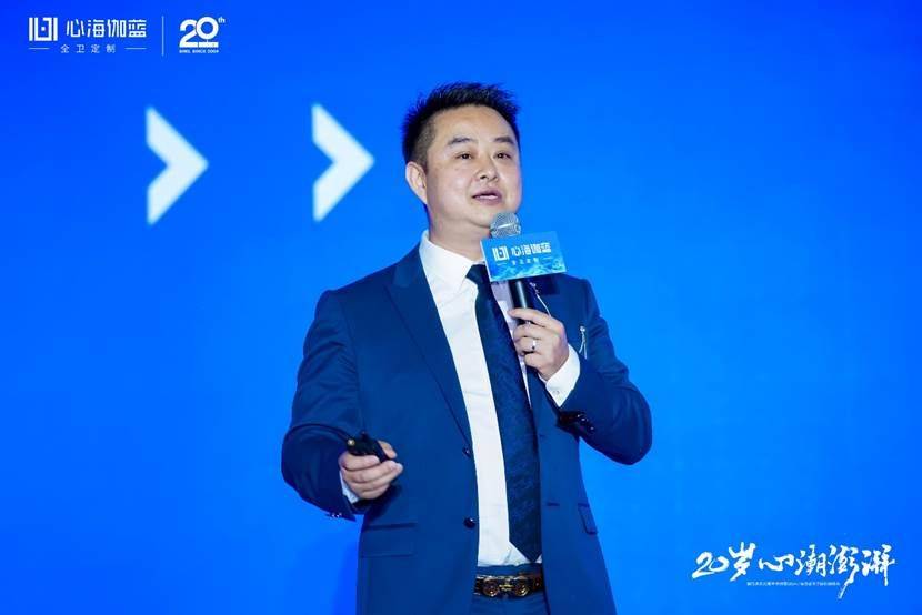 晚宴開始,張愛民董事長在閃耀燈光中登場,熱情洋溢地發(fā)表了20周年報告。張董真情流露地回顧了公司20年的發(fā)展歷程,從幾個人的從浴室柜單一品類的獨角獸到全衛(wèi)定制戰(zhàn)略領(lǐng)航,從多品牌運作到贏伽電商、凱庭淋浴房,雅頌衛(wèi)浴等七大分公司/中心集團發(fā)展,從專賣區(qū)到全國百城千家門店、至商業(yè)版圖覆蓋海外,心海伽藍(lán)始終敢為創(chuàng)新、銳意進(jìn)取,從率先扛起數(shù)智化生產(chǎn)大旗開始,心海伽藍(lán)始終堅持開放分享的態(tài)度,與行業(yè)共同成長。