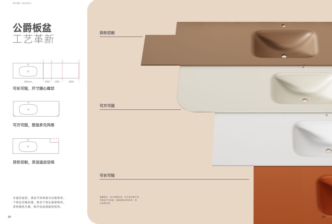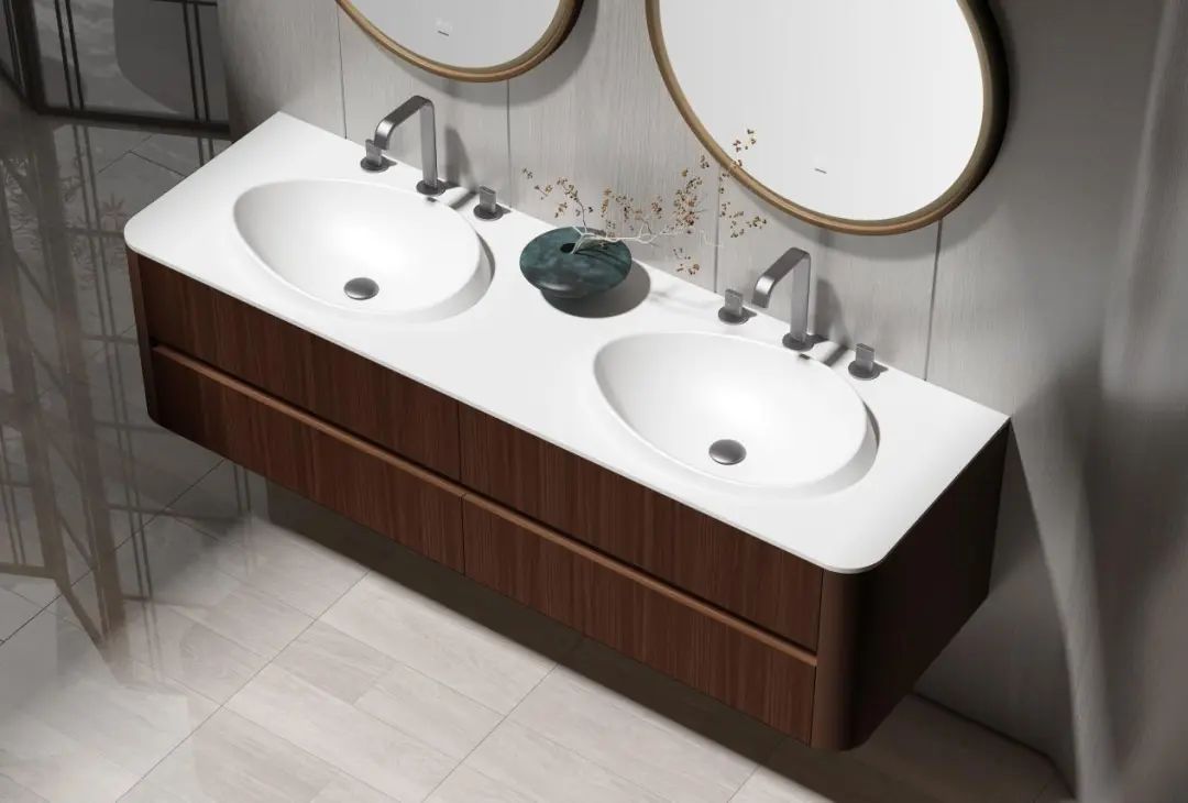 此外,帝王潔具多款「公爵板」系列產品均已上市:【奇境·定制浴室柜】展現了帝王成熟的色彩工藝,公爵板臺盆與多層實木柜體實現了質感統一、色系統一,更提供了臺上盆、臺下盆多樣化選擇;【頤和·定制浴室柜】則通過公爵板實現了藝術雙盆一體化成型設計,給予了衛浴空間更多美學想象;【和顏·定制浴室柜】通過公爵板打造了高低干濕分區臺面,以階梯式設計實現干濕分區與洗漱動線美學平衡。